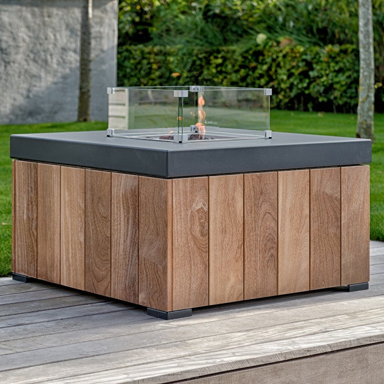 Dit is de vierkante Coral vuurtafel, een strakke vierkante vuurtafel met een aluminium tafelblad.