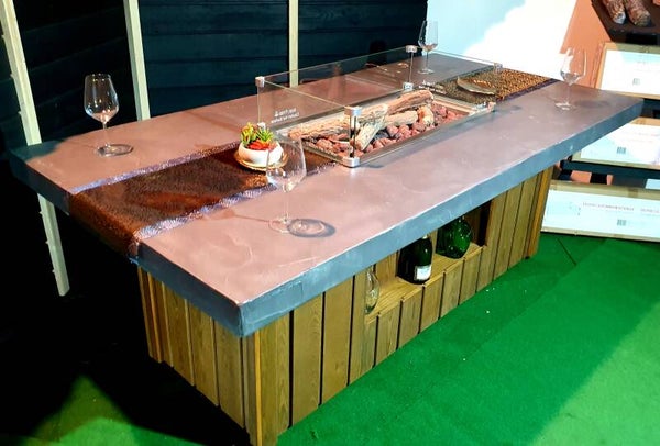 Vuurtafel werkt op propaan gas of aardgas. In de tafel is ruimte voor een glasfles.